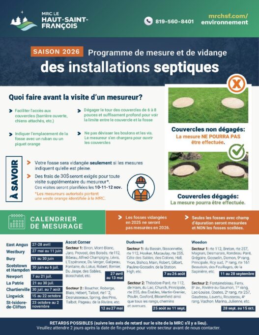 La municipalité du Canton de Westbury informe les citoyens que le service de mesure et de vidange des installations septiques sur son territoire pour la saison 2026 est offert entre le 27 mai et le 11 juin. La MRC Le Haut-Saint-François offre le mesurage pour les fosses conventionnelles avec champ d’épuration seulement. La vidange des fosses scellées et des puisards s’effectue sur demande.
